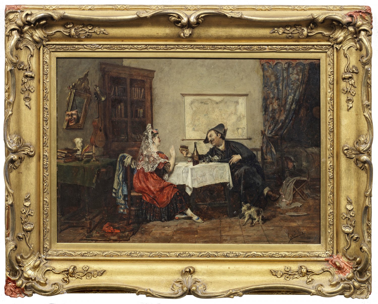 Feinmalerisch ausgeführtes, in seiner Stofflichkeit und Lichtstimmung virtuos gemaltes Genrebild. Öl/Mahagonitafel. R. u. sign. u. dat. 1870 mit Ortsangabe Valencia. Verso auf altem Etikett englisch bez. "Interior with figures By P. y Julia (Valencia) 1870". 26,5 cm x 37,5 cm. Rahmen.
