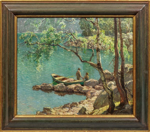 Impressionistische Landschaft mit weiblichen Akten und Ruderboot. Göhler, dem 1906 der Titel eines Professors verliehen wurde, lehrte ab 1914 an der Kunstgewerbeschule in Karlsruhe, 1920 - 1924 an der Landeskunstschule. In den Folgejahren bereiste er oft die Urlaubsorte und Seen im Alpenraum. Öl/Holztafel. R. u. sign.; Verso eigenhändig bez. "PROF H. GÖHLER" u. betitelt; Original-Etikett der Kunsthandlung H. Sagert & Co. (1939 - 1953). 55,5 cm x 66 cm. Rahmen.