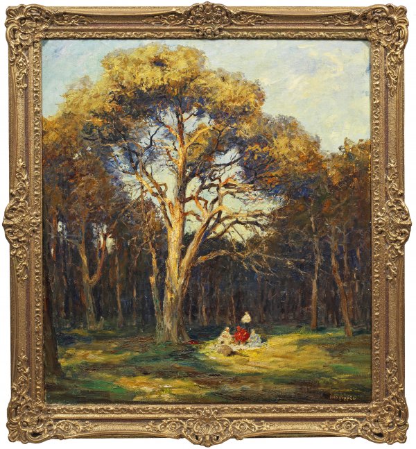 Impressionistische, in schnellem Malduktus mit pastosem, teilw. in Spachteltechnik ausgeführtem Farbauftrag gestaltete, durch die Figurengruppe belebte Landschaft. Pippel studierte in Karlsruhe und Dresden bei Gotthardt Kuehl; in Planegg bei München bzw. in Garmisch-Partenkirchen ansässig, beschickte er ab 1912 erfolgreich die Ausstellungen im Münchener Glaspalast. Außer Alpenlandschaften und -seen gehörten insbesondere Picknick-, Café- und Biergartenszenen in landschaftlichen Zusammenhängen zu seinen bevorzugten Motiven. Öl/Lwd.; R. u. sign.; Verso Atelier-Etikett vom Künstler betitelt; altes (originales) Etikett der Galerie Del Vecchio, Leipzig. 111 cm x 101 cm. Rahmen.