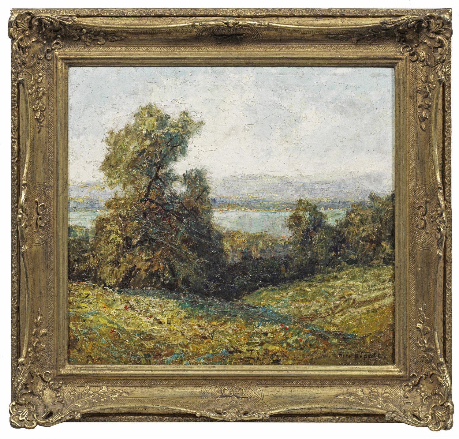 In Motiv und Stil typisches Werk Pippels, der in seinen mit pastosem Farbauftrag gemalten spätimpressionistischen Landschaften flirrende Lichteffekte schilderte. Pippel, in dessen Oeuvre Alpenseen einen Schwerpunkt bilden, studierte in Karlsruhe und Dresden bei Gotthardt Kuehl. In Planegg bei München bzw. in Garmisch-Partenkirchen ansässig, beschickte er ab 1912 erfolgreich die Ausstellungen im Münchener Glaspalast. Öl/Lwd.; R. u. sign.; 43 cm x 47,5 cm. Rahmen.