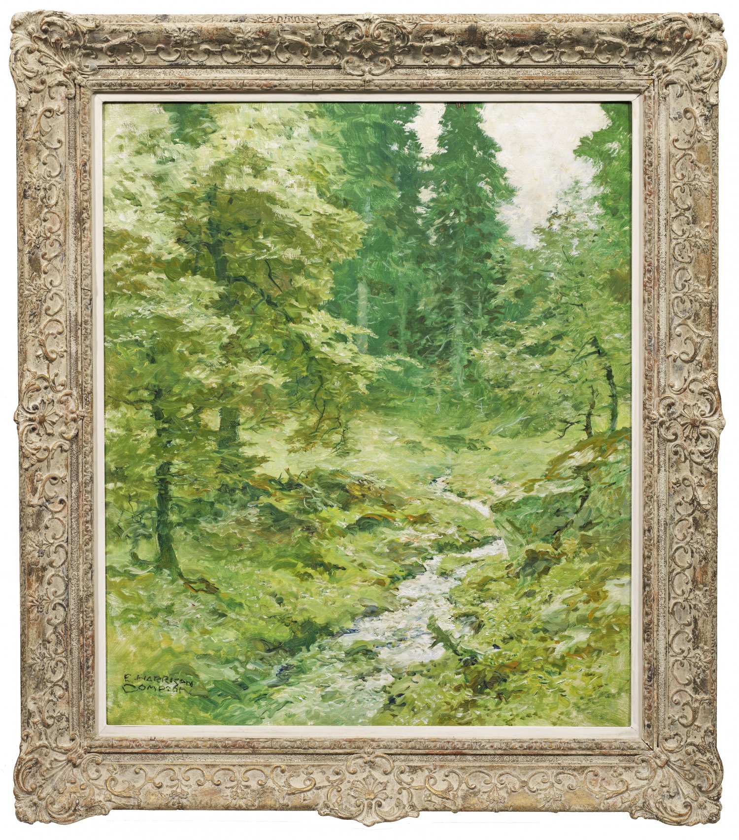 In hellem, pastelltonigem Kolorit gemaltes, impressionistisches Werk des bekannten Landschaftsmalers. Durch teilw. pastos aufgetragene Höhungen fängt Compton bei diesem Gemälde virtuos die Wirkungen des flirrenden Lichts im sonnenbeschienenen Wald ein. Außer den Alpen als seinem Hauptsujet bereiste Compton nicht nur Bayern, sondern u. a. Potsdam, Würzburg und alte Städte im süddeutschen Raum. Hierbei hielt er deren Landschaftsreize zunächst in Zeichnungen und Aquarellen fest, um diese später in seinem Atelier in Feldafing oft in Gemälde umzusetzen. Öl/Lwd.; L. u. sign.; 70 cm x 60 cm. Rahmen.