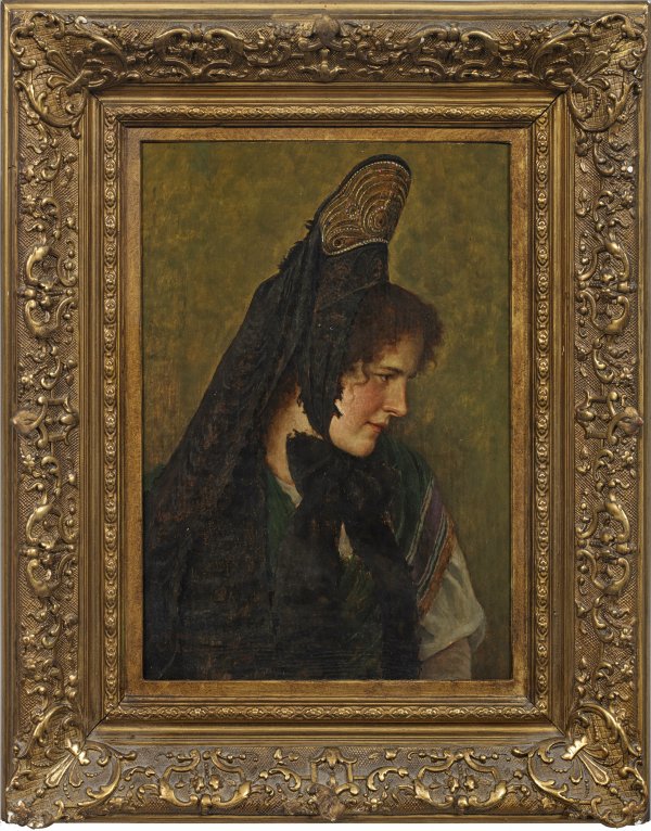 In einfühlsam, präzise ausgeführtem Duktus gemalte Darstellung einer jungen Dame im Brustporträt vor moosgrünem Hintergrund, gekleidet in eine Tracht mit prächtiger Goldhaube. Den gesenkten Blick kontemplativ aus dem Bild geführt. Repräsentatives Werk des ab 1883 an der Königlichen Akademie der Künste in München bei Nikolaus Gysis und Otto Seitz ausgebildeten Künstlers, der nach seinem Studium auch in Bremen tätig war und des Öfteren die Jahresausstellungen im Glaspalast München beschickte. Inspiriert von Defregger und Leibl spezialisierte er sich auf heimelige alpenländische Genremotive. Öl/Holz. L. u. sign.; ca. 36 cm x 27 cm. Rahmen.