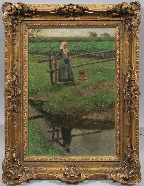 Impressionistisches Werk Strützels, der zu den deutschen Hauptvertretern der Paysage intime gehört und außer reinen Landschaften öfters bäuerliche Motive in landschaftlichen Zusammenhängen schilderte, um die enge Verbindung von Mensch und Natur zum Ausdruck zu bringen. Ab 1879 studierte er an der Düsseldorfer Akademie bei Carl Irmer und Eugen Dücker. In Düsseldorf trat er in engen Kontakt zum gleichaltrigen Hugo Mühlig, zu dem sich eine intensive künstlerisch-stilistische Verbindung ergab. 1883 gelang Strützel der künstlerische Durchbruch bei der Ausstellung im Münchener Glaspalast; 1885 wurde er in München ansässig, im Sommer hielt er sich bevorzugt in Dachau auf, um sich unmittelbar der Landschaftsmalerei zu widmen. Strützel heiratete im selben Jahr eine Schwedin, so dass fortan auch schwedische Motive zu seinem Oeuvre gehörten. Öl/Lwd.; L. u. sign.; R. u. dat. 20.7.(18)94. 50 cm x 34,5 cm. Rahmen.