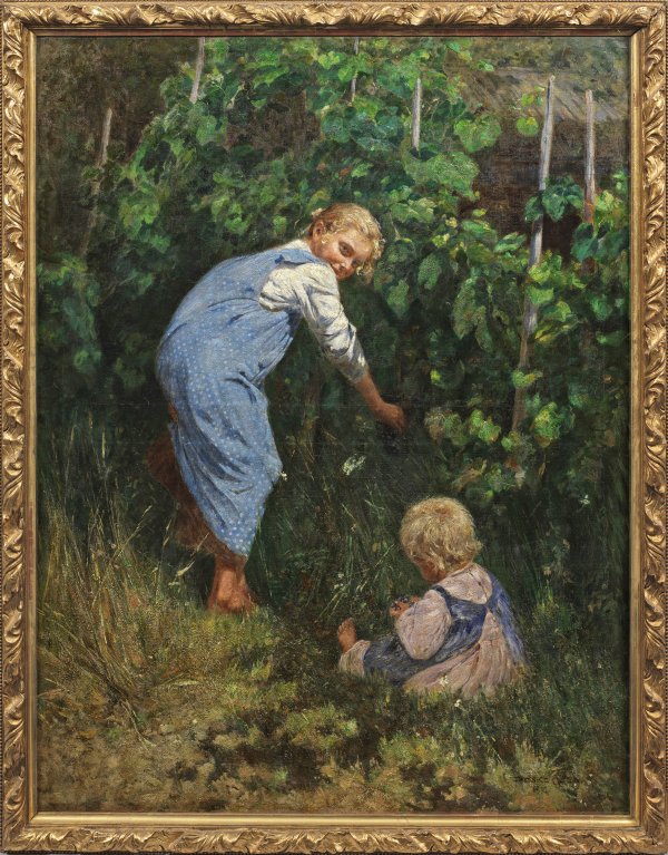 Das großformatige, impressionistische, mit weich-pastosem Farbauftrag gemalte Hauptwerk mit effektvollen Licht- und Farbakzenten stellt wahrscheinlich die Kinder des Künstlers dar. Peske studierte ab 1876 bei Gyula Benczúr und Ludwig von Löfftz an der Münchener Akademie. Zu seinem Hauptsujet, mit dem er zugleich große Erfolge feiern konnte, wurden Kindermotive bzw. Darstellungen von Bauernkindern, die er ab den 1880er Jahren im Münchener Glaspalast, im Münchener Kunstverein und 1889 auch bei der Ersten Münchener Jahresausstellung zeigte. In einem Artikel von Heinrich Glücksmann über die "Ungarische Kunst der Gegenwart" in der Zeitschrift "Die Kunst für alle" heißt es 1892 zu Peske: "Auch das ungarische Lebensbild hat an der Isar seine Maler (...). Géza Peske belauscht die Dorfjugend bei Spiel und Mahl, bei Arbeit und Ruhe, und köstliche Idyllen voll Urwüchsigkeit und harmlosen Witzes sind seine Kinderszenen". Nach achtzehnjährigem Aufenthalt in München ging er 1894 nach Ungarn, wo er sich in Budapest niederließ. 1896 beschickte er dort die Milleniums-Ausstellung in Budapest, um 1900 - 1908 auch mehrfach die Winter- und Frühjahrsausstellungen. Zu den in Motiv und Stil vergleichbaren Werken Peskes zählt das ebenfalls großformatige Gemälde "Am Sommerhaus" in der Ungarischen Nationalgalerie in Budapest. Öl/Lwd.; R. u. sign. u. dat. 1901. 152 cm x 120 cm. Rahmen.