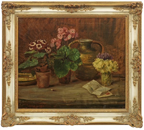 In spätimpressionistischem Duktus gemaltes, detailreiches Küchenstück. Albert Lang, der u. a. von Leibl ausgebildet wurde und einige Jahre in Italien lebte, gehörte zum Malerkreis um Carl Schuch und Hans Thoma. Öl/Lwd.; L. u. sign. und dat. 1916; 56 cm x 64 cm. Rahmen.