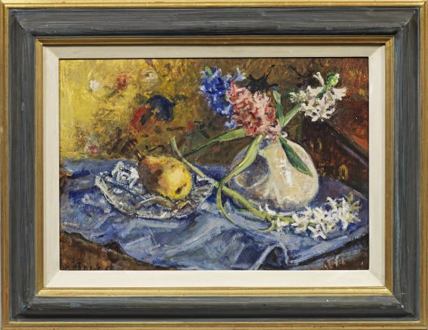 Mit schnellem, weich-pastosem Duktus gemaltes, spätimpressionistisches Stillleben. Bock studierte ab 1906 an der Kunstakademie, u. a. als Meisterschüler Heinrich von Zügels. 1908 beteiligte er sich erstmals an einer Ausstellung der Secession und wurde 1917 deren Mitglied. Von prägendem Einfluss war 1913 eine Paris-Reise, wo er die französische Moderne, Werke von Matisse und Cézanne kennenlernte. Ab 1918 beschickte Bock regelmäßig Ausstellungen, besonders im Glaspalast. 1929 erhielt er den Rom-Preis und das hiermit verbundene Villa Massimo-Stipendium. Öl/Hartfaser. L. u. sign.; 37 cm x 52 cm Rahmen.