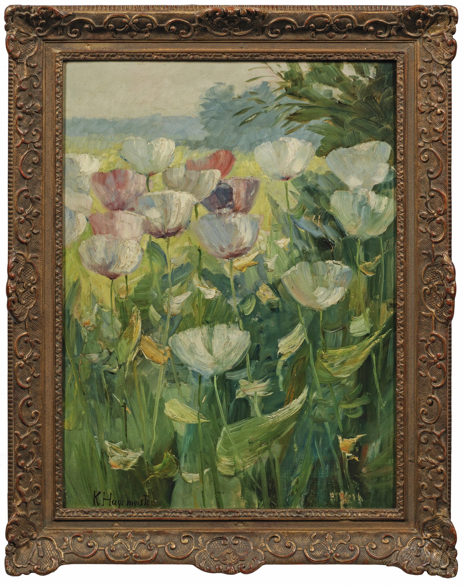 Um 1882 entstandenes, mit breitem Duktus in hellem, pastelltonigem Kolorit gemaltes, frühes Werk Hagemeisters, das in seiner Flächigkeit bereits einen erstaunlich hohen Abstraktionsgrad zeigt. Es gehört zu einer Gruppe von ausschnitthaft komponierten Landschaften mit Mohn, zu der sich weitere Vergleichsstücke in der Berliner Nationalgalerie und im Bröhan-Museum in Berlin befinden. Zugleich spiegelt die vorliegende sommerliche Mohnblumenlandschaft die Ideale und Intentionen des Künstlers wider, das Wachstum und die Stimmungen in der Natur unmittelbar festzuhalten. Zu den Bewunderern von Hagemeisters Mohnblumenbildern gehörte schon als junger Künstler Lovis Corinth. Hagemeister ließ sich 1877 nach seinem Studium bei Friedrich Preller an der Zeichenschule in Weimar und Studienreisen mit dem befreundeten Maler Carl Schuch, in seiner alten Heimat bei Werder nieder. Seine Motive fand er in den nahen Landschaften in Brandenburg mit seinen Seen, Feldern und Wäldern sowie an der Ostsee. 1898 war Hagemeister mit Max Liebermann Gründungsmitglied der Berliner Secession, an deren Ausstellungen er sich bis 1917 beteiligte; 1923 wurde er auf Initiative von Liebermann ordentliches Mitglied der Akademie der Künste. Hagemeister gehört als Freilichtmaler zu den eigenständigsten und zugleich modernsten deutschen Impressionisten. Öl/Malkarton. Sign., 67 cm x 49 cm. Rahmen.