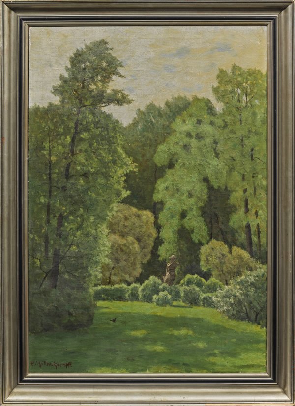 Die sommerliche Stimmung einfangende, durch ihr Motiv außergewöhnliche Landschaft des Impressionisten. Müller-Kaempff studierte an den Akademien in Düsseldorf, Karlsruhe und Berlin bei Gustav Schönleber und Hans Fredrik Gude und begründete 1889/92 die Künstlerkolonie in Ahrenshoop. Neben vielfach variierten Motiven aus Ahrenshoop, vom Darß, Bodden und Fischland schilderte er die rauen und still-poetischen Stimmungsreize der Landschaften in weiteren Teilen Mecklenburgs. Daneben stand Müller-Kaempff in enger Verbindung zu seiner Heimatstadt und dem Großherzogtum Oldenburg, wo er sich Anfang des 20. Jhs. aktiv am Kunstleben beteiligte, die dortigen Landschaften malte und zur nahen Künstlerkolonie Dötlingen gehörte. 1915 verlegte Müller-Kaempff seinen Wohnsitz von Ahrenshoop wieder nach Berlin. Außer an Museen in Rostock, Oldenburg, Kiel und Hamburg verkaufte Müller-Kaempff seine Gemälde vornehmlich an Privatsammler. Zu ihnen zählte auch Prinz Eitel Friedrich, der zweite Sohn Kaiser Wilhelm II, der 1908 mehrere Werke für den kaiserlichen Hof erwarb. Öl/Lwd.; L. u. sign.; 100 cm x 70 cm. Rahmen. Das Gemälde wird von Dr. Konrad Mahlfeld in den Nachtrag seines Werkverzeichnisses zu Paul Müller-Kaempff unter der Nr. G 1342 aufgenommen.