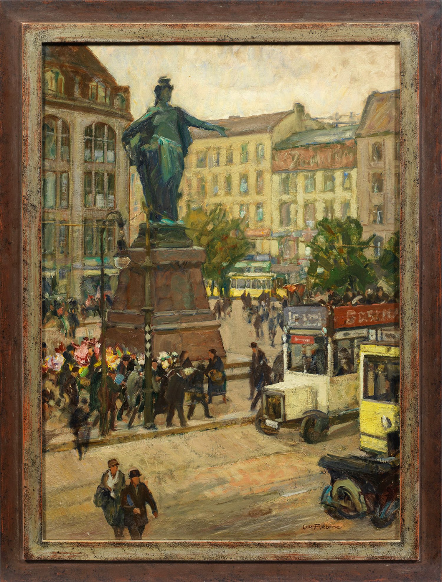 Impressionistischer Blick auf den von zahlreichen Passanten, Omnibussen und Automobilen belebten Alexanderplatz Anfang der 1920er Jahre vor der Versetzung der "Berolina" im Jahr 1925 und der Platz-Umgestaltung 1929 - 1932; im Hintergrund ist links das 1904 - 1911 erstellte, berühmte Kaufhaus Hermann Tietz zu sehen. Antoine war ab 1891 in Berlin ansässig, wo er bei Franz Skarbina lernte. 1893 debütierte Antoine auf der Großen Berliner Kunstausstellung, ab 1911 war er dort mit Berliner Motiven vertreten. In der Folgezeit wurde Antoine zu einem der bedeutendsten Maler und Chronisten der Metropole mit seinen repräsentativen, monumentalen Bauten, Straßen und Plätzen. Seine impressionistischen Schilderungen der Großstadt waren absolut zeitgenössisch - auf die Wiedergabe des Lichts und der Bewegung konzentriert, spontan und direkt vor dem Motiv gestaltet. In Gemälden wie dieser Ansicht des Alexanderplatzes verdichtete er das pulsierende, moderne Lebensgefühl Berlins atmosphärisch. Öl/Lwd.; R. u. sign.; Verso bez., betitelt u. dat. 1922(?). 84 cm x 60,5 cm. Rahmen.