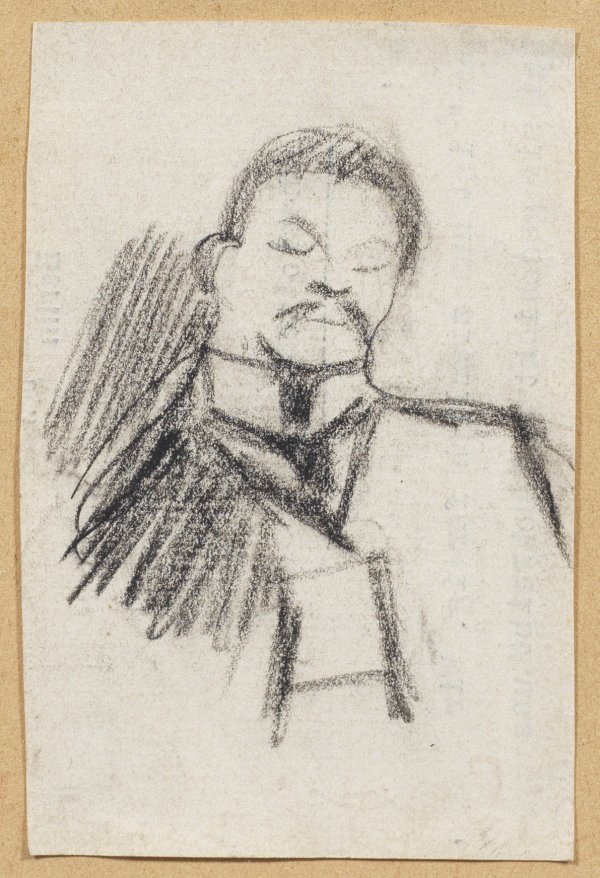 Mit schnellen Strichen den Mann charakterisierendes Blatt Zilles, das seine Meisterschaft als Zeichner zum Ausdruck bringt. Schwarze Kreide/Papier (Rückseite eines an Zille adressierten Briefes). Nachlass-Stempel "Heinrich Zille" in Rot (Lugt 2676b, Rosenbach 1). Ca. 10,3 cm x 6,8 cm. Rahmen.