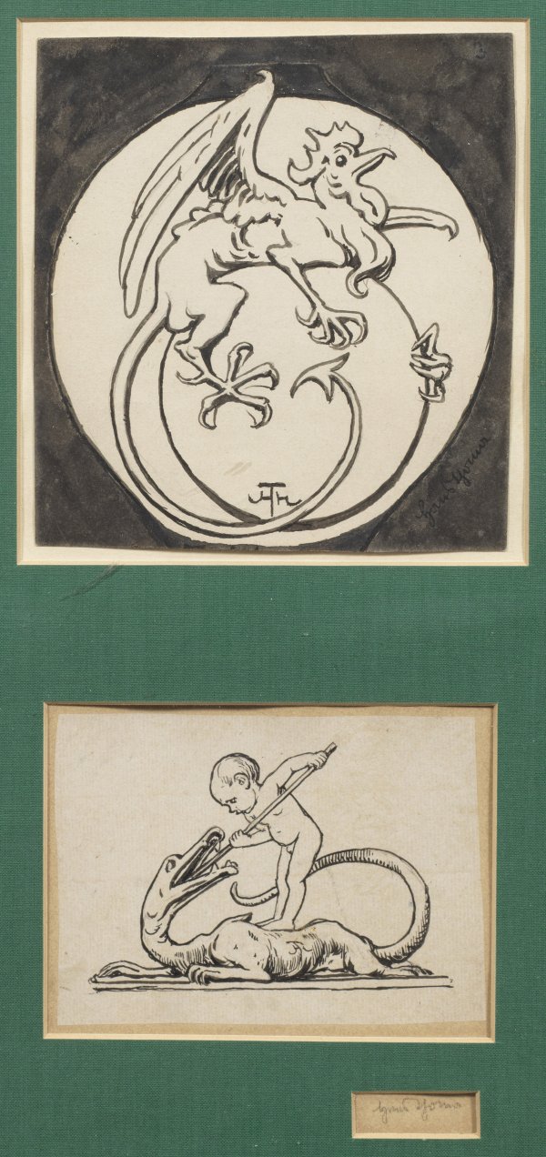 Zwei symbolistische Jugendstil-Zeichnungen Thomas, in dessen vielfältigem Oeuvre als Maler, Zeichner und Grafiker fantasiereiche, stilisierte Drachen, Vögel, mythologische und mystische Wesen wiederkehrende Motive sind. Thoma, der sich der Münchner Secession anschloss, wurde 1899 Professor an der Karlsruher Kunstschule. Feder u. Tusche/Papier. Jeweils sign. bzw. mit Ligatur-Monogr.; 10,5-17 cm x 14,4cm-15 cm. Im Sammelrahmen.