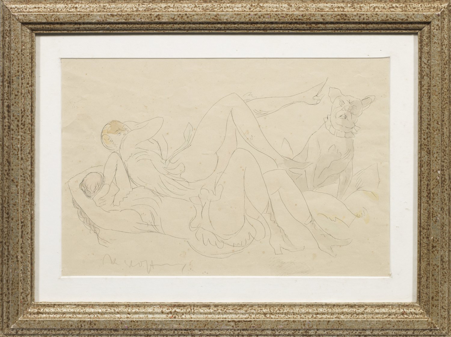 Aquarellierte Gelatineradierung/Papier. Sign.; Ger. knickfaltig u. stockfleckig. Ca. 24 cm x 35,5 cm (Passepartoutausschnitt). Rahmen.