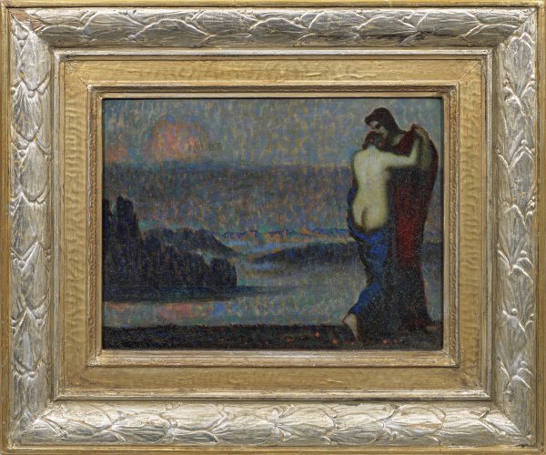 Das in vorwiegend tonigem Kolorit und wenigen leuchtenden Farbakzenten angelegte, motiv- und stiltypische Gemälde gehört zu den symbolistischen Jugendstil-Gemälden des Schweizer Malers, durch die er bekannt wurde. Oft stellte er hierin Liebespaare, mythologische und bacchantische Szenen dar, stark beeinflusst von Franz von Stuck, dessen Assistent er 1909 in München wurde. Öl/Malkarton. L. u. sign.; Verso bez. "A. Frey Moock-München Atelier 1909". 26,5 cm x 36 cm. Wohl Original-Rahmen.