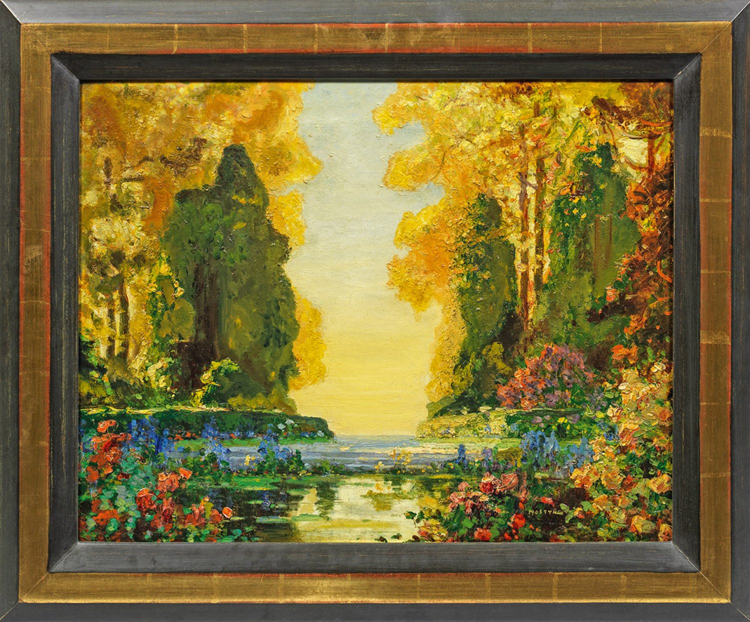 Leuchtend farbige, teilw. pastos gemalte, poetische Parklandschaft, wohl nach 1918. Mostyn wuchs in Manchester auf, wo er an der Akademie studierte. 1891 stellte er erstmals in der Royal Academy in London aus. 1893 besuchte er die Kunstschule von Hubert von Herkomer, der ihn prägte. Nach einer Phase romantischer Parkszenerien und präraffaelitischer Darstellungen junger Frauen wandelten sich Stil und Themen ab 1918, als er von London nach Devon zog. Er begann, fantasievolle, stärker stilisierte Gartenlandschaften in freierer Technik zu malen, teilw. mit dem Spachtel. 1919 - 1925 hatte er Einzelausstellungen in der Fine Art Society, London; außerdem stellte er im Royal Institute of Oil Painters aus, das ihn 1917 zum Mitglied wählte. Öl/Lwd.; R. u. sign.; Verso betitelt; Malwarenstempel von Charles Roberson & Co., 99 Long Acre, London (1913 - 1937). 51 cm x 69 cm. Rahmen.