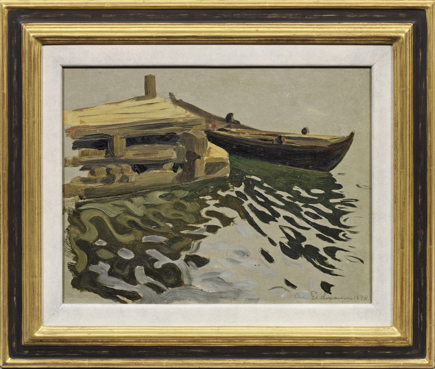 Impressionistische, ausschnitthafte Darstellung mit sich bewegt spiegelnden Wellen auf dem Wasser. Frühes Werk des schwedischen Malers, der bei Richard Bergh, Per Hasselberg, Anders Zorn und Carl Larsson studierte, später auch in Kopenhagen. Mit Werken ist Axel Erdmann u. a. im Nationalmuseum, im Göteborger Kunstmuseum und im Museum in Östersund vertreten. Öl/Papier, auf Hartfaser kaschiert. R. u. sowie verso sign. u. dat. 1898. 23 cm x 30 cm. Rahmen.