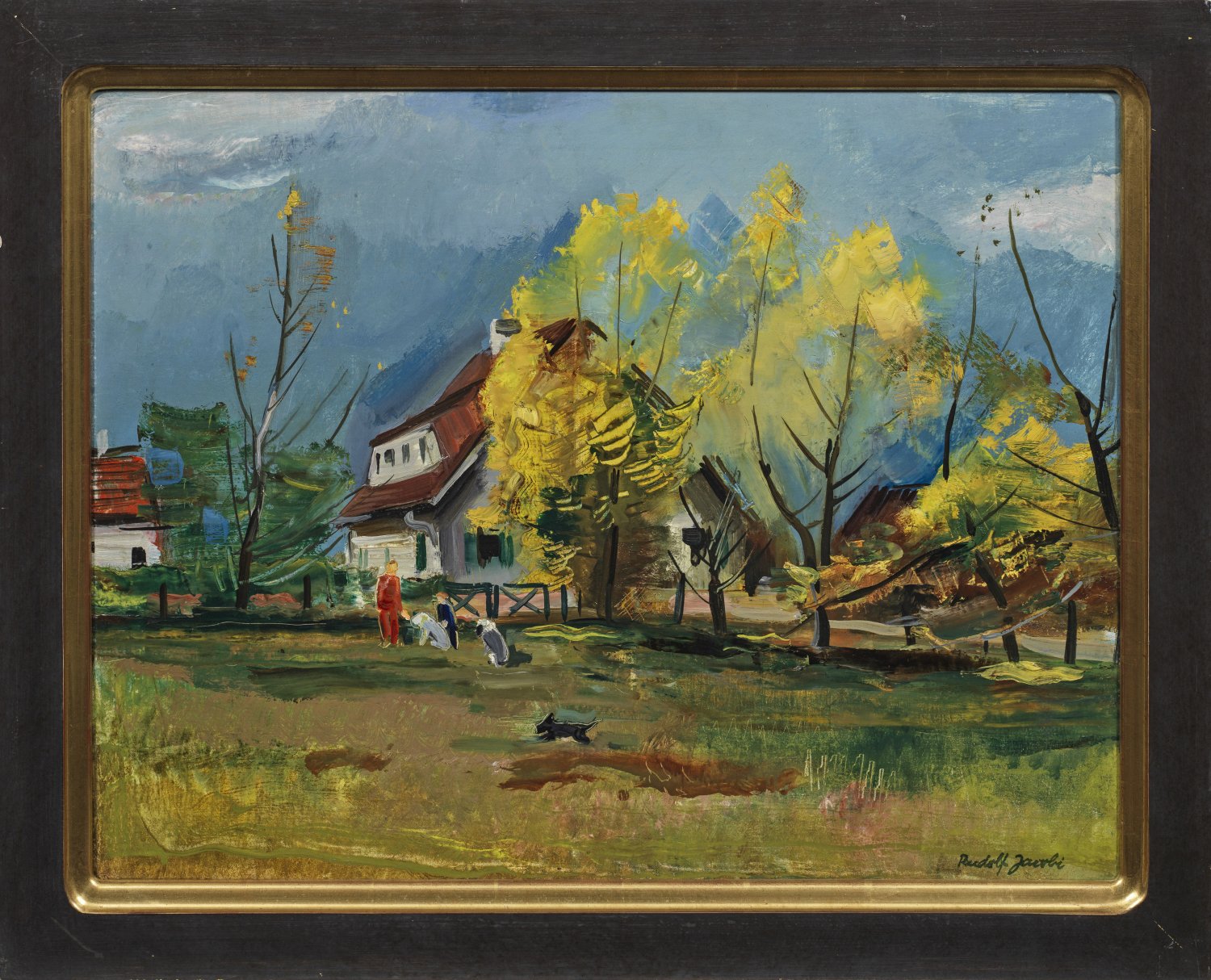 Expressionistisches Werk Jacobis, der zu den bedeutenden Künstlern der sog. "Verschollenen" bzw. "Verlorenen Generation" gehört. 1926 - 1928 lebte Rudolf für zwei Jahre in Paris, wo ihn Maurice de Vlaminck beeinflusste. 1928 eröffnete er mit seiner gleichfalls als Künstlerin tätigen Frau die Malschule "Annot" in Berlin und wurde Mitglied der Berliner Secession. In den Folgejahren hatte er größere Erfolge, bis er 1933 aus politischen Gründen in die USA emigrierte. Das Künstlerpaar gründete 1934 erneut eine Kunstschule in New York, an der auch Rudolf Belling unterrichtete. Erst 1967 kehrte Jacobi nach Deutschland zurück. Öl/Lwd., doubl.; R. u. sign.; 50,5 cm x 65 cm. Rahmen.