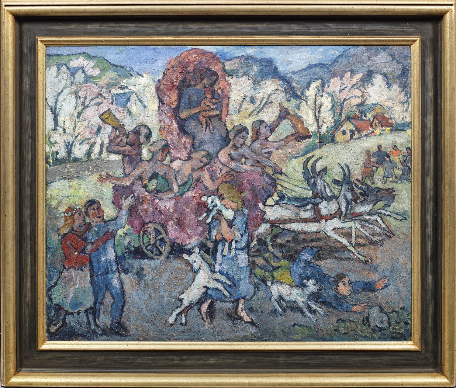 Mit breitem, weich pastosem Duktus und betonten Umrissen ausgeführtes, expressionistisches Werk mit szenischer, allegorischer Darstellung. Schubert studierte 1913/14 bei Emanuel Hegenbarth an der Dresdener Akademie, 1917/18 war er Meisterschüler bei Otto Gussmann und Otto Hettner und wurde mit dem Großen Staatspreis ausgezeichnet. 1919 gründete Schubert zusammen mit Otto Dix und Conrad Felixmüller die "Dresdner Sezession Gruppe 1919". 1922 hatte er seine erste große Einzelausstellung in der Galerie Flechtheim in Berlin. 1937 wurden viele Werke Schuberts durch die Nationalsozialisten während der Aktion "Entartete Kunst" vernichtet. Öl/Lwd; L. u. sign.; Verso betitelt "Triumph Frühling". 88 cm x 110 cm. Rahmen.