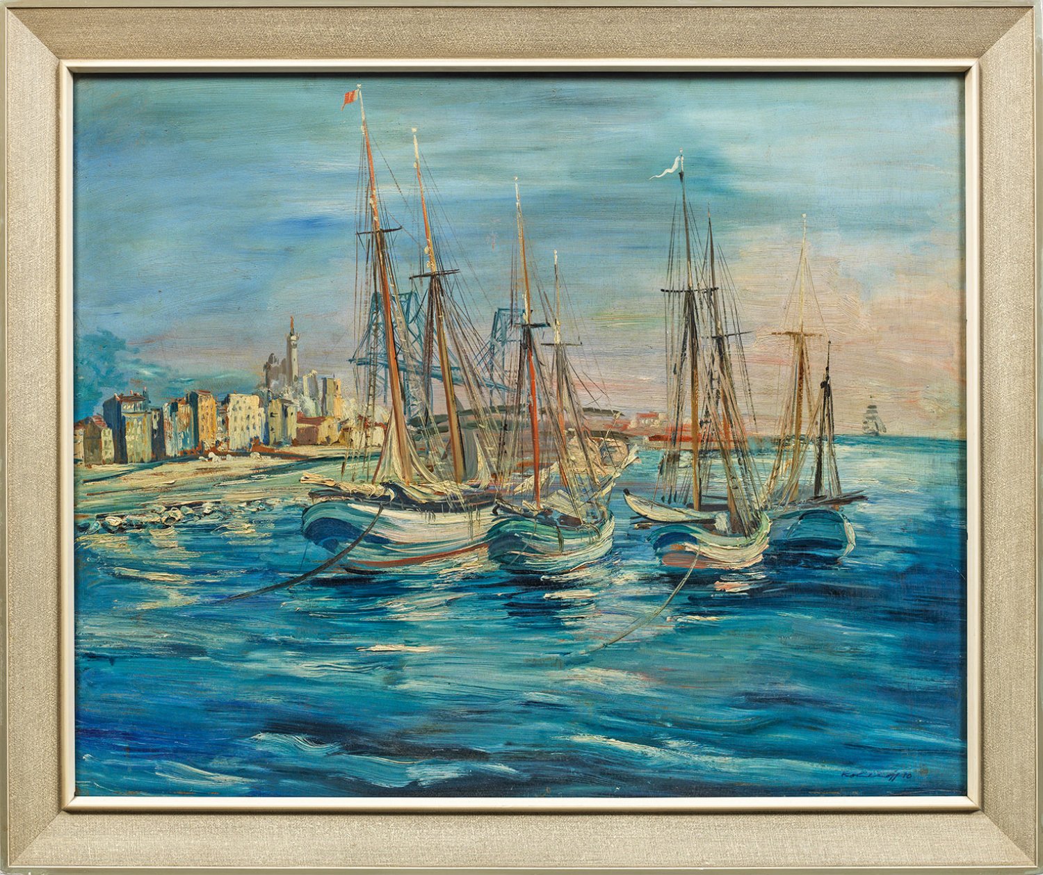 Expressives, stiltypisches Hauptwerk Kohlhoffs aus dessen bedeutendster Schaffensperiode. Kohlhoff debütierte 1914 auf der Großen Berliner Kunstausstellung; 1917 trat er der "Berliner Secession" bei; 1919 gewann er den Großen Preußischen Staatspreis. In der Weimarer Republik gehörte Kohlhoff zu den renommiertesten Berliner Künstlern, der mit Kokoschka, Hofer, Grosz, Dix und Beckmann ausstellte. Die Bilder dieser Epoche zeichnen sich durch vehemente Pinselführung und einen dynamischen, rhythmischen Schwung voller Kraft und Verve aus, seine Palette wird zunehmend heller. In dieser Zeit unternahm er erste ausgedehnte Studienreisen nach Südfrankreich. Öl/Sperrholztafel. R. u. sign. u. dat. (19)30. Verso Künstler-Bez. mit Betitelung u. Ausstellungs-Nr., teilw. auf Original-Etikett. 79,5 cm x 99,5 cm. Rahmen.