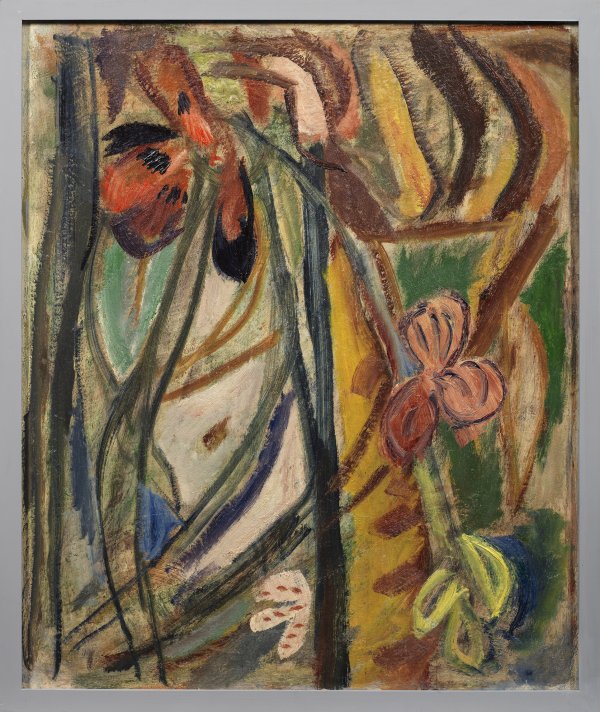 Expressionistisches, von Werken der "Brücke"-Maler und des "Blauen Reiter" beeinflusstes Gemälde Janthurs, der die unterschiedlichen Strömungen der Moderne aufnahm. 1912 gründete er gemeinsam mit Ludwig Meidner und Jacob Steinhardt die Künstlergruppe "Die Pathetiker", mit der er in der "Sturm"-Galerie ausstellte. 1918/19 schloss er sich der "Novembergruppe" und dem "Arbeitsrat für Kunst" an. Öl/Malkarton. Ca. 77 cm x 65 cm. Rahmen.
