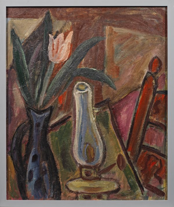 Doppelseitiges Stillleben mit Tulpe in Vase, Petroleumlampe, Stuhl und Blumenstängeln