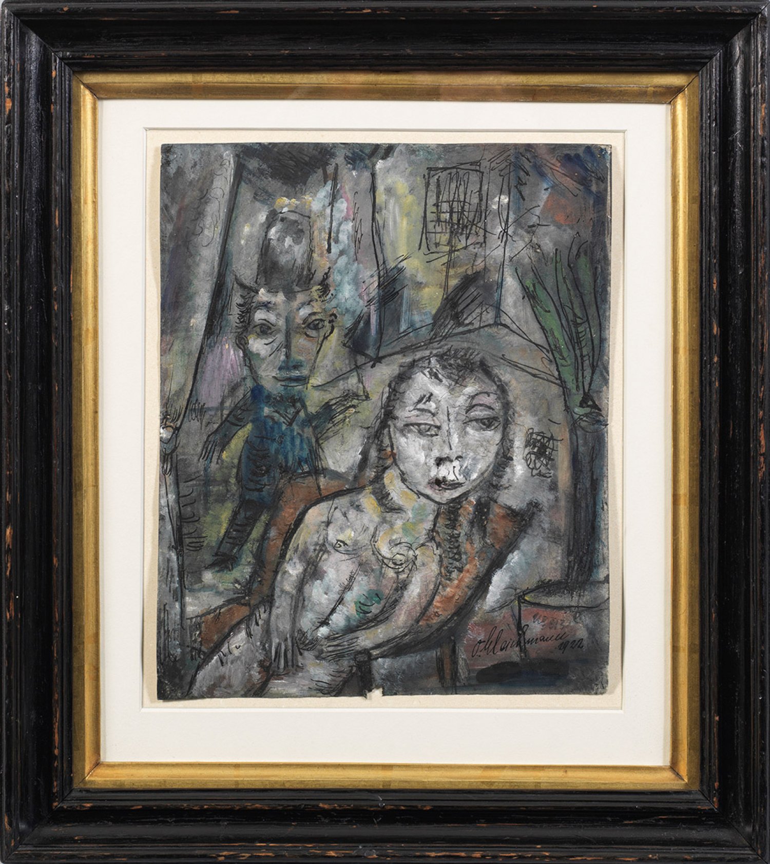 Charakteristisches, expressionistisches Blatt des Künstlers von 1922, das durch flächige Verzeichnung der Raumebenen und der mit furiosen Strichen grotesk geschilderten Figuren mit überdimensionalen Köpfen gekennzeichnet ist. Häufiger schilderte Gleichmann in jenen Jahren Akte und weiblich-männliche Gegensatzpaare wie in dieser Arbeit, bei der sich die junge Frau vom älteren Mann distanziert abwendet. Gleichmann wurde nach dem I. Weltkrieg in Hannover ansässig, wo er sich der "Hannoverschen Sezession" anschloss und zum Künstlerkreis um Kurt Schwitters gehörte. Zugleich pflegte Gleichmann eine intensive Freundschaft mit Theodor Däubler. 1919 und 1921 erschienen Grafik-Mappen bei Paul Cassirer und in der Galerie Flechtheim. Eine Zäsur bedeutete 1936 das über ihn verhängte Ausstellungsverbot durch die Nationalsozialisten. Im Jahr danach wurden 27 Werke aus deutschen Museen beschlagnahmt und einige in der NS-Ausstellung "Entartete Kunst" gezeigt. Feder u. Gouache/Papier. R. u. sign. dat. 1922 und mit "No= 313" bez.; Drei alte minim. Läsuren am Gesicht des Aktes und am unteren Rand. Ca. 29 cm x 24 cm. Rahmen.