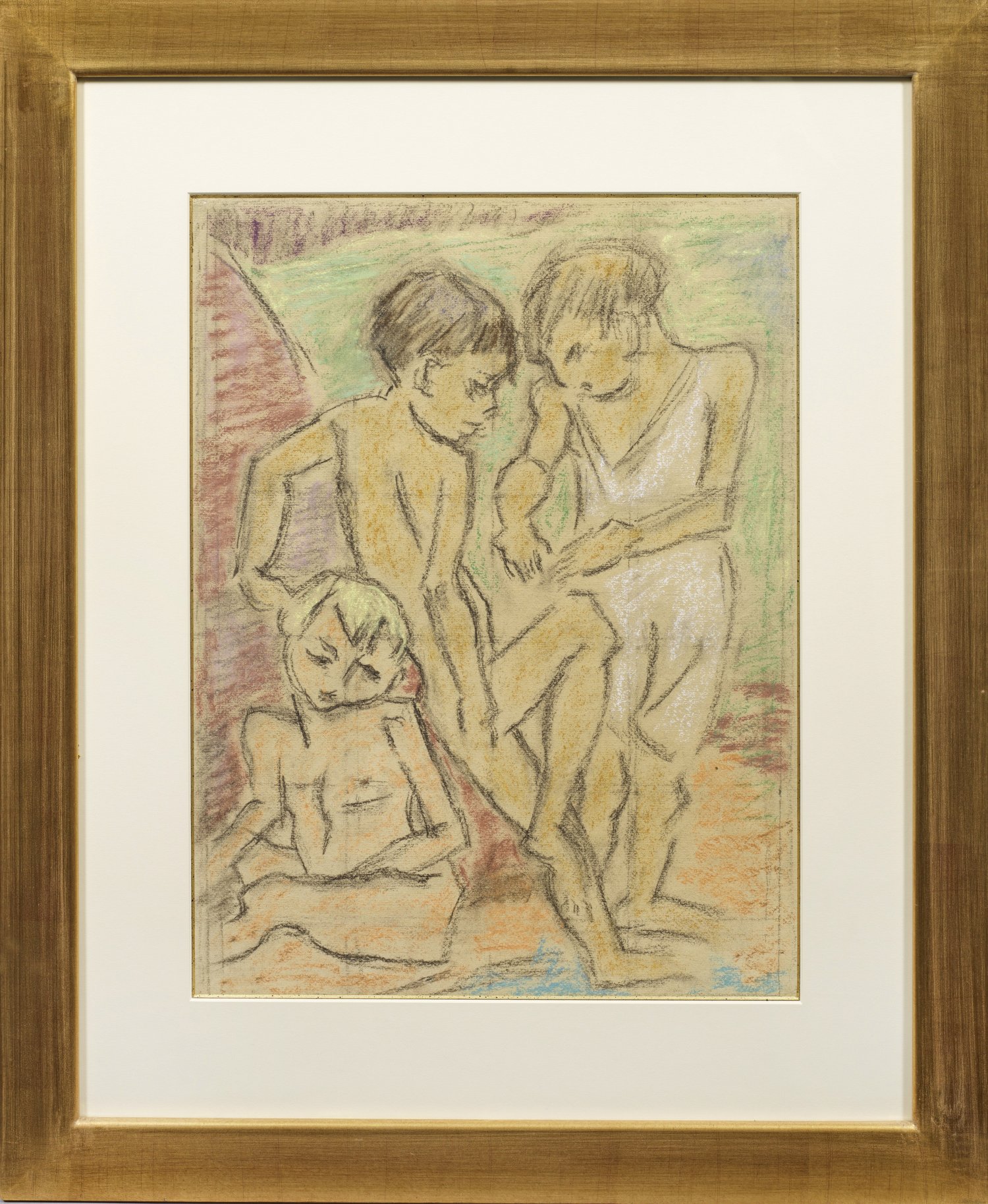 Expressionistisches Werk Kothers, das in Motiv und Stil durch Otto Mueller beeinflusst ist, mit dem er seit Studienzeiten befreundet war und dessen Schwager er 1909 wurde. Kother gehört zu den bedeutenden wiederentdeckten Künstlern der sog. "verschollenen Generation". Prägend wirkten auf ihn die mit Mueller ebenfalls zur Künstlergruppe "Brücke" gehörenden Maler Max Pechstein und Erich Heckel. 1914 ging Kother nach Berlin, wo ihn Herwarth Walden 1916 zusammen mit Max Pechstein und Lyonel Feininger in seiner "Sturm"-Galerie zeigte. Ab 1918 reihten sich die Erfolge: 1919 beteiligte er sich mit der "Novembergruppe" an der Großen Berliner Kunstausstellung, 1921 widmete ihm die Galerie Moeller eine Einzelausstellung; 1922 erhielt Kother durch Max Liebermann den Ehrenpreis der Preußischen Akademie der Künste. Farbkreiden oder Pastell/Papier. Ca. 60 cm x 46 cm (Passepartoutausschnitt). Rahmen.