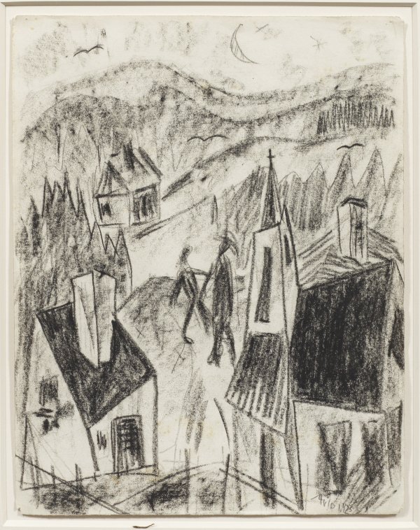 Von Lyonel Feininger und Paul Klee beeinflusstes, frühes Blatt des Künstlers, der zum näheren Bauhaus- und Schwitters-Kreis zählt. In der von ihm 1918 mitgegründeten "Gesellschaft für Freunde junger Kunst" zählten auch Feininger und Klee zu den Mitgliedern; Wassily Kandinsky entwarf das Signet der Gruppe. Während der Ferienwochen am Bauhaus in Weimar und Dessau lernte er in den Ateliers von Klee, Kandinsky und Laszló Moholy-Nagy. 1927 hatte Maatsch eine große Einzelausstellung in der Galerie "Der Sturm" in Berlin. Kohle/Papier. R. u.sign u. dat. 1923. Verso Sign.-Stempel mit Dat. "1922-24". 30 cm x 23,5 cm. Rahmen.