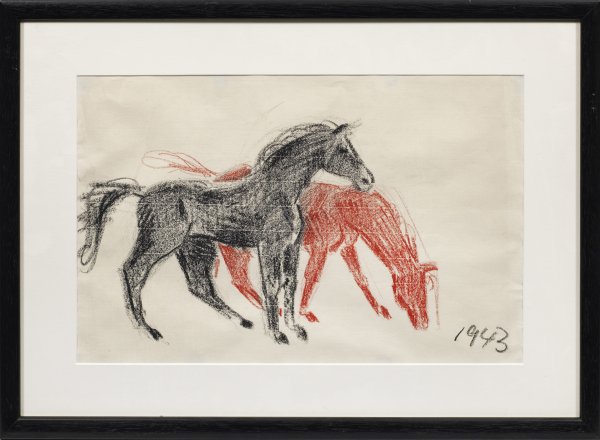 Black and red wax or oil chalk on paper. Dated 1943. Estate stamp with no. on the backing board.