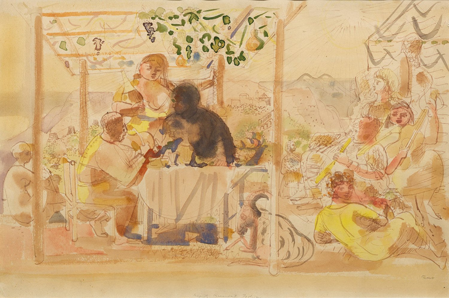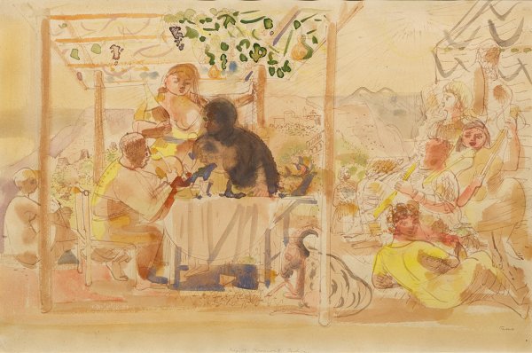 Frank studierte ab 1926 Kunst, u. a. für kurze Zeit bei Karl Hofer an der Berliner Kunstakademie. Seine eigentliche Karriere setzte erst nach dem Zweiten Weltkrieg ein, als er Mitglied in mehreren neu entstandenen Künstlervereinigungen wurde. Er fand unter dem Eindruck der Klassischen Moderne einen eigenen, nie den Gegenstand negierenden Stil. In seinem umfangreichen, von der Aquarellmalerei bestimmten Werk geht es nicht um erzählerische Momente. Die Bilder erscheinen vielmehr als Chiffren für das menschliche Dasein. Aquarell/Papier. R. u. sign. und bez.; 32,5 cm x 49 cm (Passepartoutausschnitt). Rahmen.