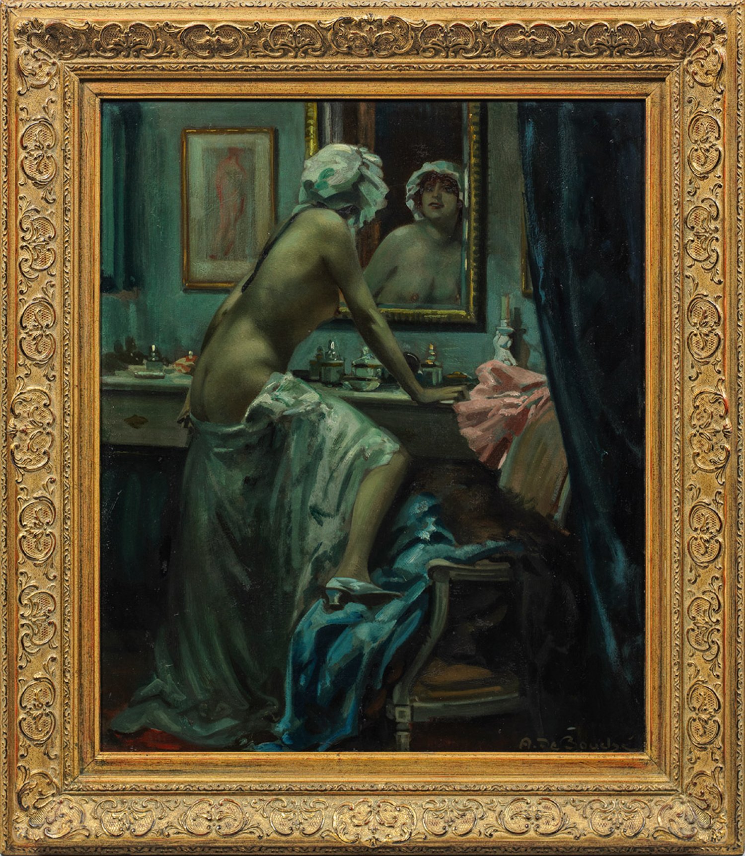Szenische Darstellung mit einer sich im Spiegel betrachtenden, jungen Frau. In Motiv und Stil charakteristisches Aktbild des Künstlers, der an der Münchener Akademie bei Gabriel von Hackl und Paul Hoecker studierte. Ab 1901 beschickte er die Ausstellungen im Münchener Glaspalast, 1904 und 1914 nahm er überdies an den Großen Berliner Kunstausstellungen teil. Öl/Malkarton. R. u. sign.; 67 cm x 56 cm. Rahmen.