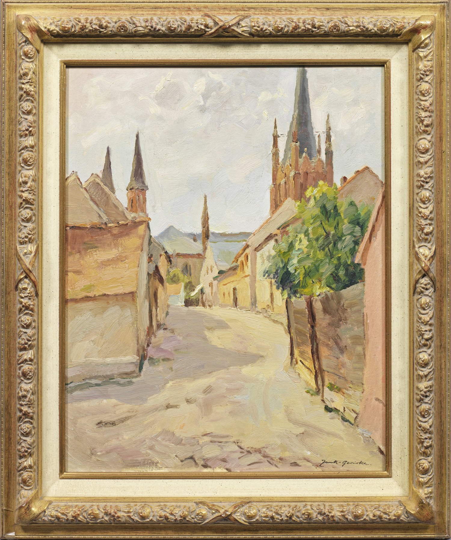 Spätimpressionistisches Werk des Künstlerduos Zank und Gericke, die 1921 - 1929 in der Kunstschule von Johannes Walter-Kurau in Berlin lernten und danach gemeinsam in Berlin, ab 1945 in Falkensee malten. Öl/Lwd.; R. u. sign.; Verso Nachlass-Stempel mit Wvz.-Nr. 499. 51 cm x 41 cm. Rahmen.