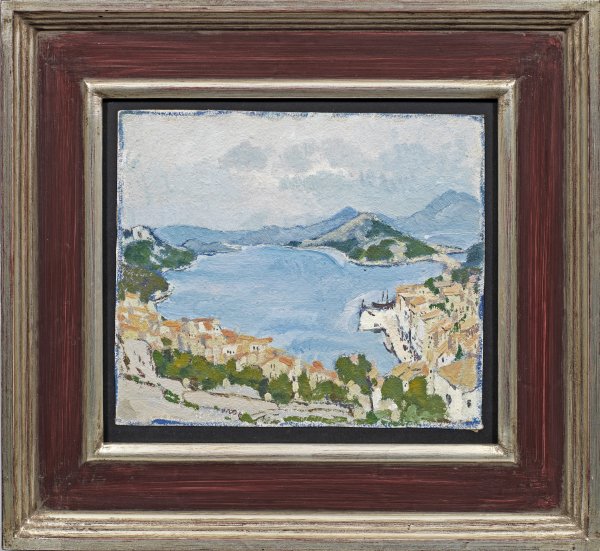 Südliche Küstenlandschaft mit Stadt an einer kleinen Bucht