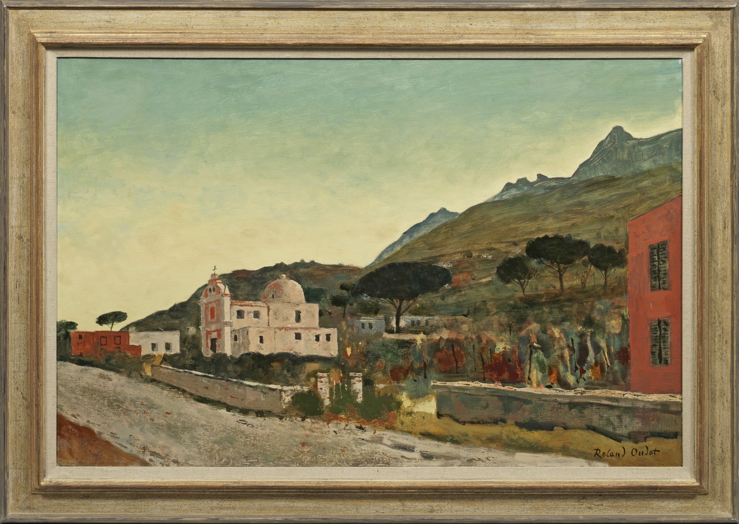 Blick auf eine alte, pittoreske Kapelle an der Straße nach Forio unterhalb eines auf der rechten Seite aufragenden, mit Pinien bestandenen Berghanges. Flächig komponierte Landschaft des Spätimpressionisten, die den tiefen Einfluss Paul Cézannes auf sein Oeuvre widerspiegelt. Oudot war 1915 - 1923 Assistent von Léon Bakst bei den Ballets Russes, der ihn erstmals mit den Gemälden Cézannes, Pierre Bonnards und Édouard Vuillards vertraut machte. Beeinflusst von der französischen Kunst der Moderne entwickelte er seinen eigenen Stil. 1919 debütierte Oudot auf dem Salon d'Automne, es folgten zahlreiche Einzelausstellungen und Ausstellungsbeteiligungen, u. a. bei der Biennale in Venedig. 1935 schloss sich Oudot der Künstlergruppe "Les peintres de la réalité poétique" (Maler der poetischen Realität) an. Öl/Lwd.; R. u. sign. Verso betitelt. 65 cm x 100 cm. Rahmen.