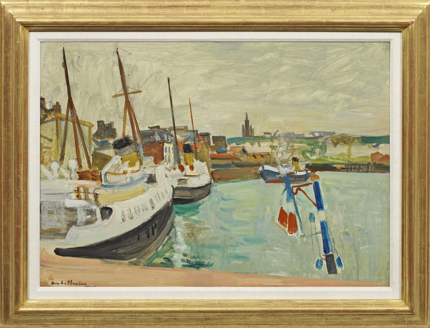 Ausdrucksstarkes, stark flächig komponiertes Werk Plansons, dessen Oeuvre wesentlich von den Fauvisten, insbesondere Maurice de Vlaminck und Henri Matisse beeinflusst wurde. Der Maler studierte bei Maurice Denis an der Académie Ranson in Paris, 1923 stellte er erstmals im "Salon des Indépendants" aus, danach auch im "Salon d'Automne". Später wurde er Mitglied der 1935 gegründeten Künstlergruppe "Peintres de la réalité poétique" und wirkte als Professor an der Académie Julian. Öl/Malkarton. L. u. sign.; Verso Ortsangabe Dieppe. 46 cm x 65 cm. Rahmen.