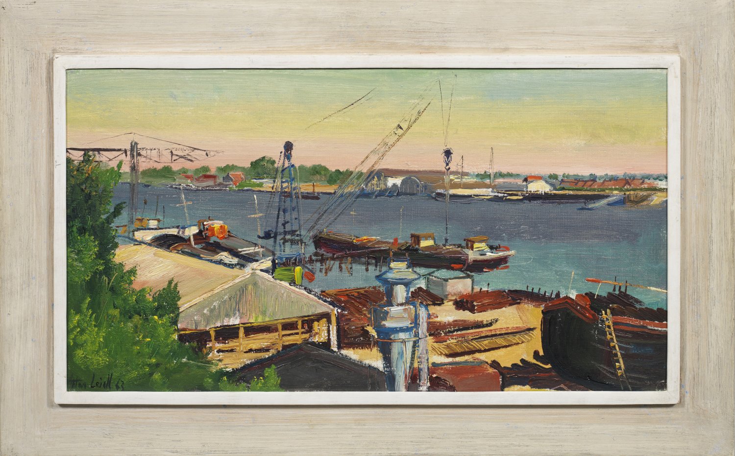 Blick auf die Weser mit Hafenszenerie bei oder in Bremen. Expressiv-realistische Landschaft aus einer 1963 entstandenen Werkreihe mit Bremen-Ansichten. Leidl studierte 1921 - 1928 an der Münchener Akademie und stellte 1927 erstmals aus. Nach der Kriegszerstörung seines Münchener Ateliers ging Leidl 1943 nach Tutzing am Starnberger See. Dort schuf er außer Porträts bedeutender Persönlichkeiten wie Theodor Heuss vor allem Landschaften. Öl/Lwd.; L. u. sign. u. dat. (19)63. Verso betitelt. 32,5 cm x 60,5 cm. Rahmen.