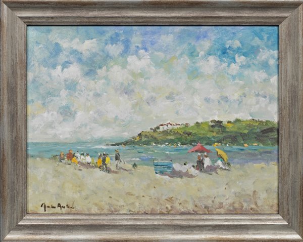 In Motiv und Stil charakteristisches, von Eugène Boudin inspririertes Werk des Künstlers, der 30 Jahre in St. Ives in Cornwall lebte und dort neben Marinebildern u. a. impressionistische Strandszenen wie diese malte. Ab 1985 stellte er u. a. in der Royal Society of Marine Artists (RSMA) und im Royal Institute of Painters in Oil aus, 1990 wurde er in die Royal Society of Marine Artists gewählt. Öl/Hartfaser. L. u. sign.; 30 cm x 40 cm. Rahmen.