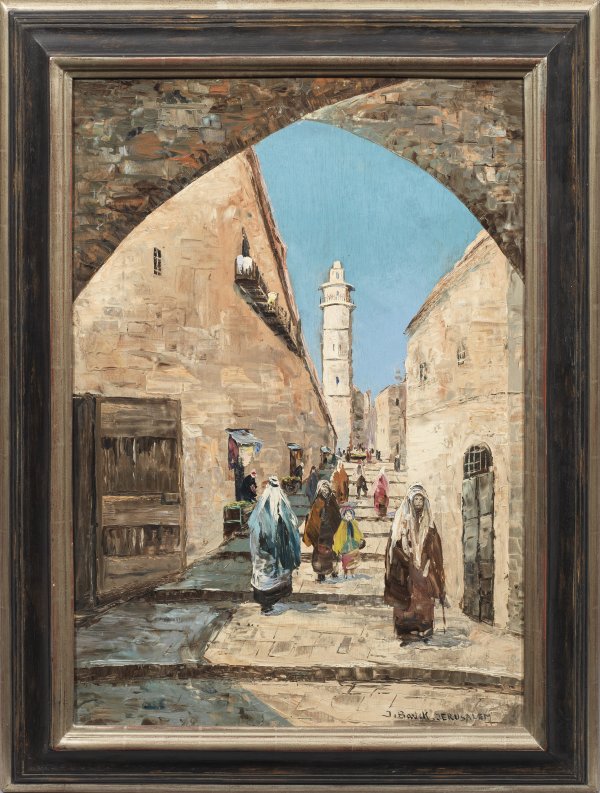 Spätimpressionistisch gemalte, lichtdurchflutete, durch Figurenstaffage belebte Straße mit Blick auf ein Minarett. Haupsujet des Künstlers waren mediterrane Landschaften, insbesondere Motive aus Israel, u. a. Haifa und Jerusalem. Öl/Sperrholztafel. R. u. sign. mit Ortsangabe Jerusalem. 67 cm x 47 cm.