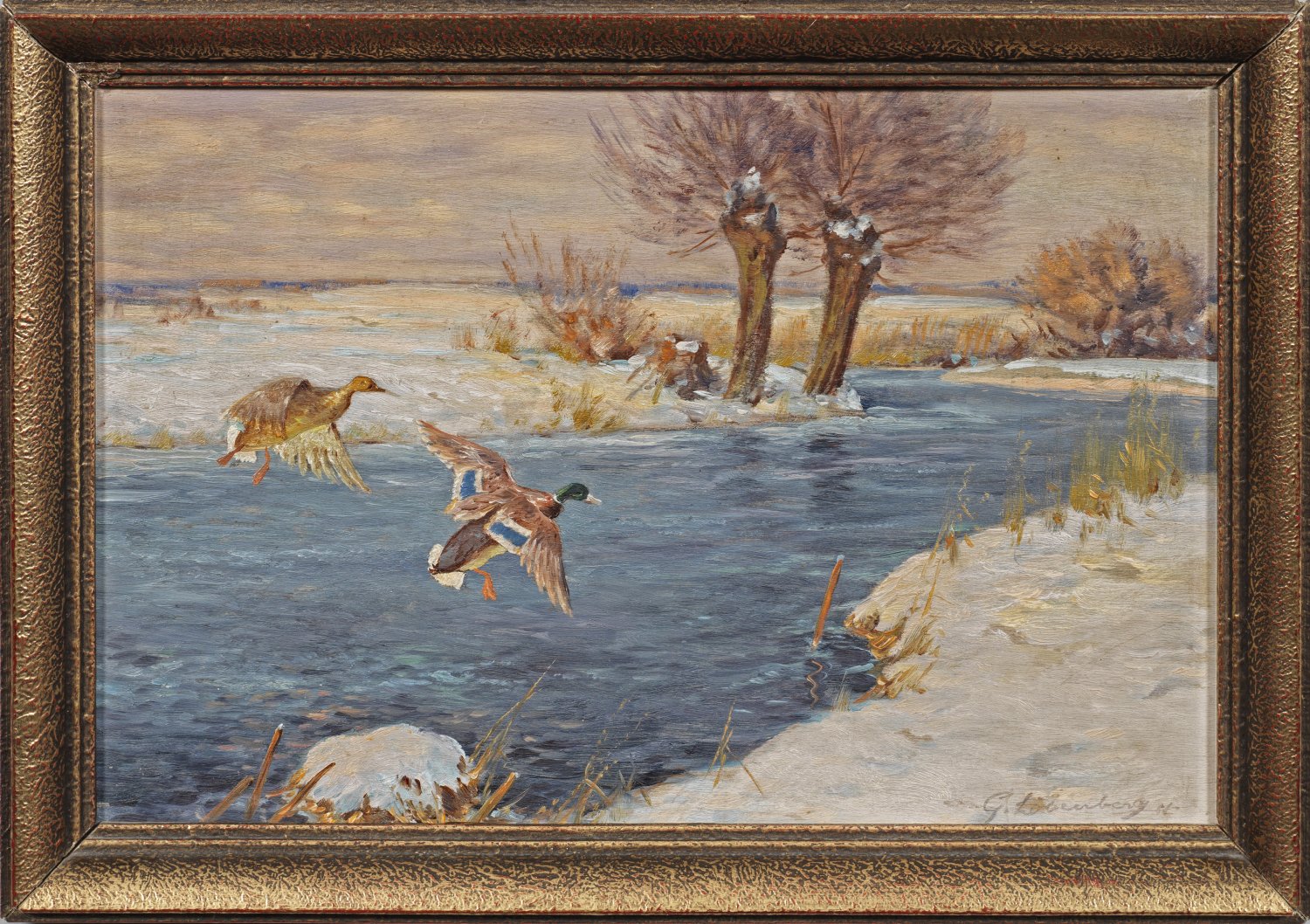 Fliegende Wildenten über einem winterlich verschneiten Bachlauf