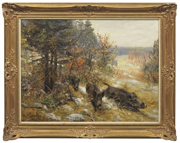 Wildschweine gehören zu den bevorzugten Sujets des Tiermalers Willi Lorenz. Sein Können zeigt sich besonders in der feinflüssig dargestellten Bewegung der Tiere. Öl/Lwd.; L. u. sign.; 60,5 x 80 cm. Rahmen.