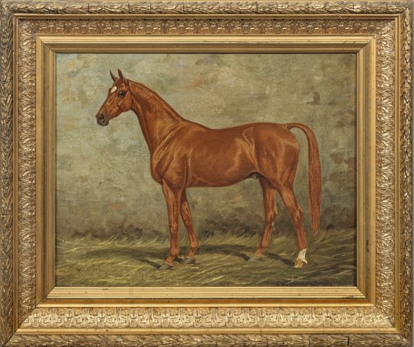 Der als Pferdemaler renommierte Düsseldorfer Künstler erhielt zahlreiche Porträtaufträge für edle Rasse- und Rennpferde, die er typischerweise im Ganzfiguren-Profil ausführte. Öl/Lwd.; L. u. sign.; Verso altes Etikett mit Angaben zur Darstellung. 32 cm x 41 cm. Rahmen.