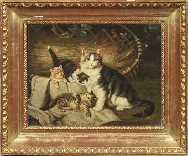 Subtil beobachtetes, charakteristisches, lebendig geschildertes Motiv des auf Katzendarstellungen spezialisierten Künstlers. Der wegen seines Haupsujets auch "Katzenkögel" genannte Tiermaler stand in der Tradition des Münchener Malers Julius Adam, der sich ebenfalls vornehmlich mit Katzenmotiven befasste. Öl/Holztafel. L. u. sign.; 30 cm x 39,5 cm. Rahmen.