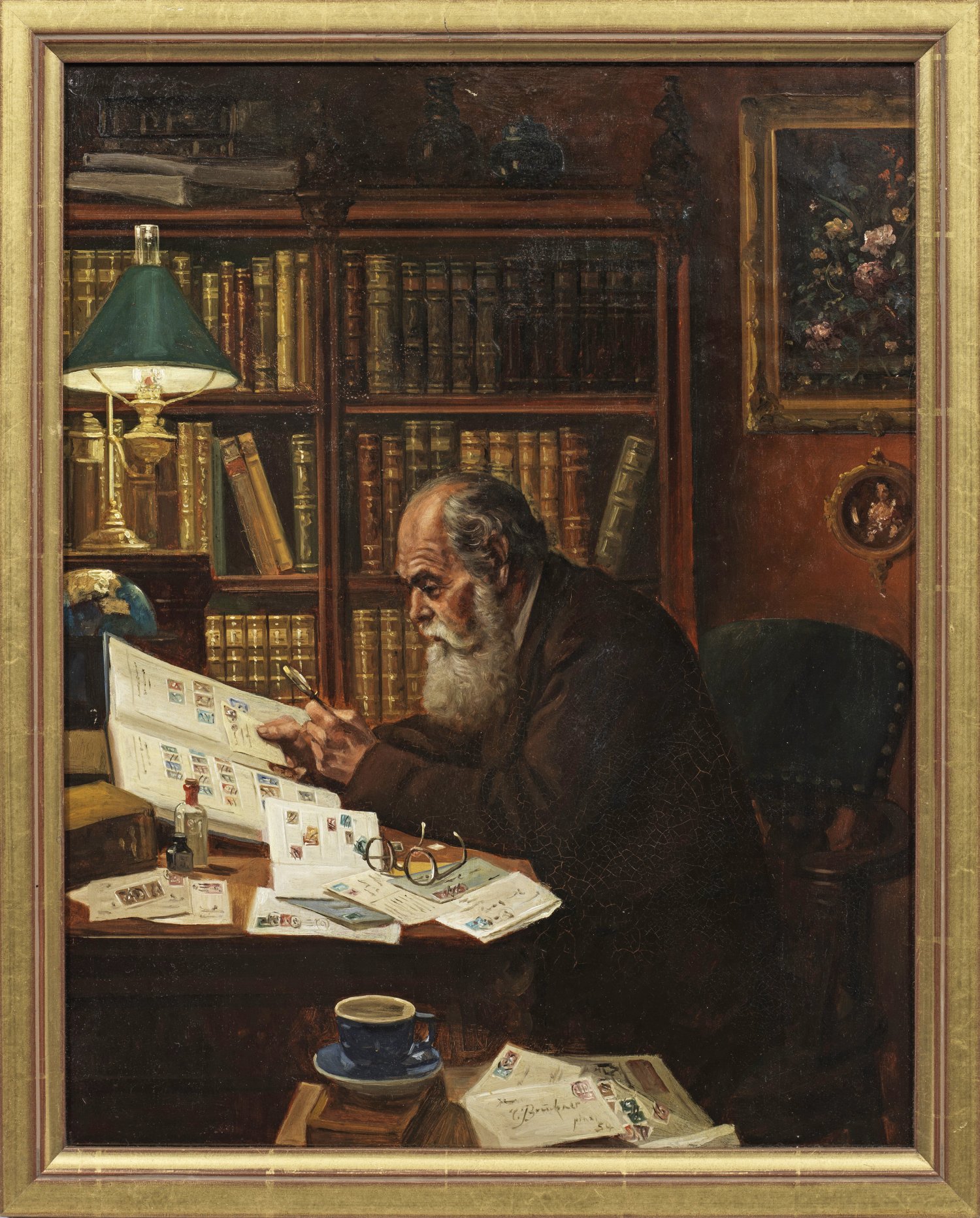 Ein in seiner Bibliothek vor einem mit Ledereinbänden gut bestückten Regal und Gemälden an der Wand sitzender Philatelist über seinen Alben, konzentriert die Qualität seiner Briefmarken prüfend. Neben ihm auf einem Beistelltisch ein Umschlag, der die Datierung (19)54 und die Signatur des Künstlers als Curt Bruckner trägt. Nach seinem Studium in Berlin zog Bruckner-Echtermayers, auch bekannt als Curt Bruckner, C. Echtermeyer oder C. Brückner nach Paris, wo er später zum Kreis der Surrealisten gehörte. Als Echtermeyer schuf er düster-surreale Szenen, als Curt Bruckner Genrebilder von zufriedenen, in einer verklärt romantischen Umgebung lebenden Menschen. Öl auf Hartfaser.; U. m. sign. u. dat. (19)54. Verso Etikett des Künstlers mit Echtheitsbestätigung. 50 cm x 45 cm, Rahmen.
