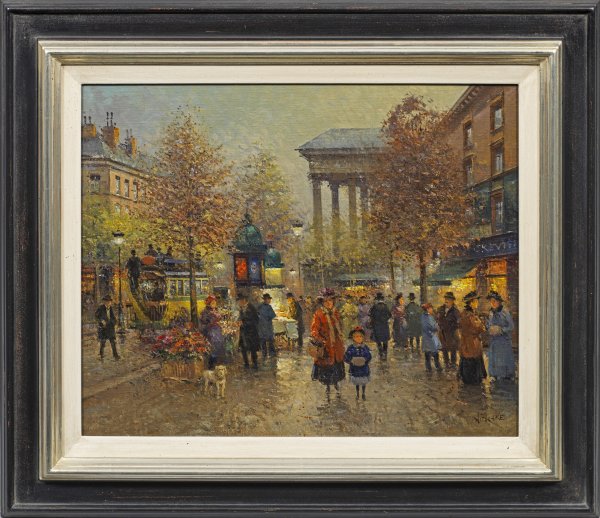 Vielfigurige, belebte Szene in der Belle Epoque. Neoimpressionistisches, von Eugène Galien-Laloue inspiriertes Werk Nitschkes, bei der er die spezifische Abendstimmung und die Effekte des künstlichen Lichtes wiedergibt. Mit Vorliebe malt Nitschke nostalgische Veduten und Straßenszenen aus den europäischen Metropolen um 1900, in denen er die heitere, atmosphärische Stimmung und das pulsierende großstädtische Leben jener Jahre widerspiegelt. Auf diesem Gemälde schildert er den Charme von Paris vor La Madeleine, die zu den bedeutendsten Sehenswürdigkeiten der Stadt gehört. Öl/Lwd., auf Platte kaschiert. R. u. sign.; 40 cm x 50 cm. Rahmen.