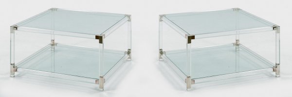 Acrylglas, Metall und farbloses Glas. Gestell aus gekanteten Streben und Stegen als Träger für eingelegte, quadratische Deckplatte. Unterhalb korrespondierendes Ablagefach. Teilw. besch.; H. 44 cm. 85 cm x 85 cm.