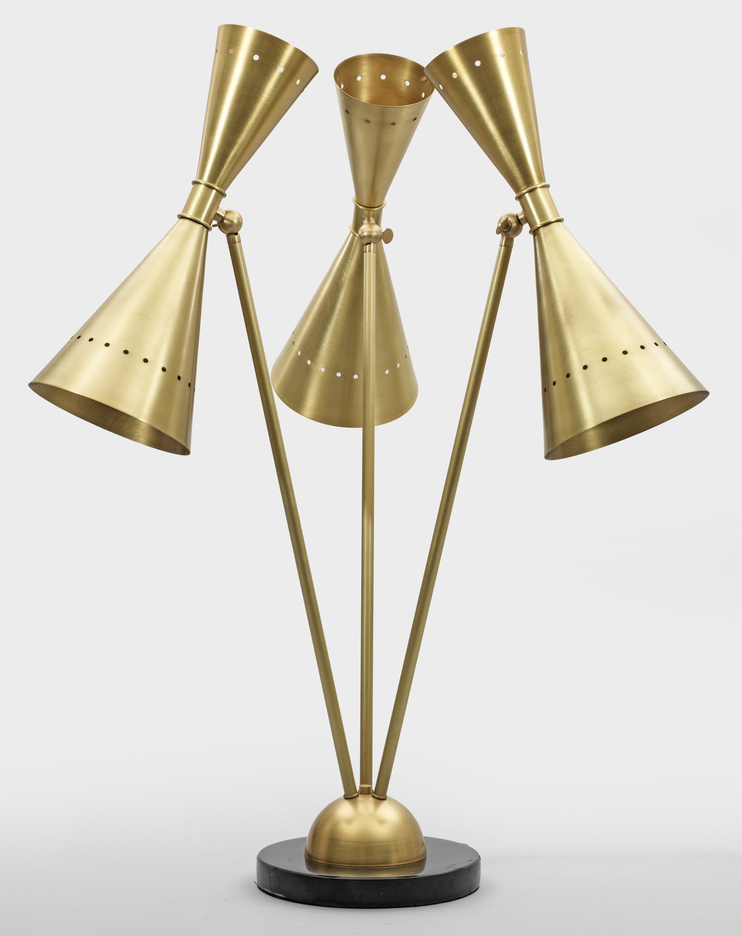 3-flg.; Messing, mattiert und schwarzer Marmor. Über flachem Rundsockel Halbkugelelement. Davon ausgehend schräggestellte, schlanke Schäfte als Träger für tütenförmige, schwenkbare Lampenschirme. Elektrifiziert. H. 83 cm.