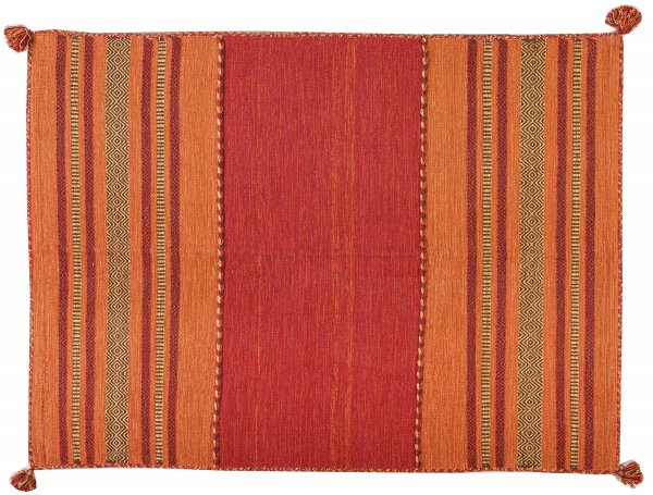 Nordafrika. Wolle auf Wolle, flach gewebt. Flächendeckende Streifen-Musterung aus unterschiedlich breiten Bändern mit geometrischem Dekor sowie monochrome Partien in unterschiedlichen Rot- und Orangetönen. 240 cm x 180 cm.