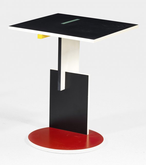Holz bzw. MDF, schwarz, weiß sowie rot und gelb lackiert. Konstruktiv gestalteter Korpus aus ineinander verschränkten Rechtecken auf flachem Rundsockel als Träger für quadratische Deckplatte. Unbez., Entw. Gerrit Rietveld, 1922-1923. H. 62 cm. 50 cm x 50 cm.