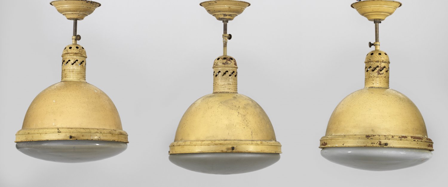 Three German lacquered metal industrial ceiling lamps.