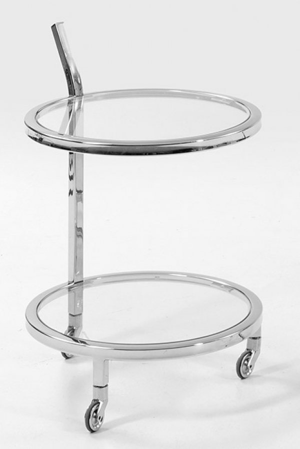 Metall, vernickelt und farbloses Glas. Offen gestaltetes Gestell aus gekanteter Strebe und kurzen Beinen auf Rollen als Träger für runde Abstellflächen mit Glaseinlage. H. 72 cm. D. 50 cm.