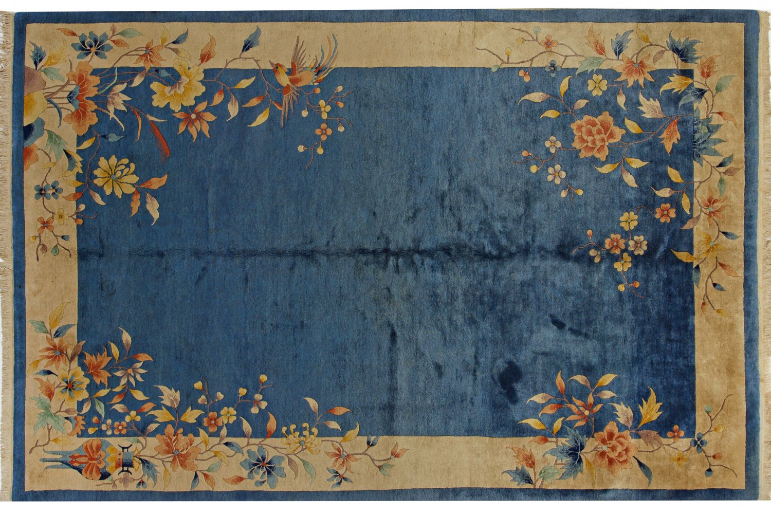China. Wolle auf Baumwolle. Hellblaues, monochromes Innenfeld. Umlaufend breite, gelbe Bordüre. In den Ecken großflächig angelegte, unterschiedliche Blütenzweige, Vasenmotiv und Phönix. 268 cm x 180 cm.